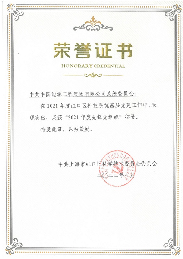 會議的最后,對虹口區(qū)科技系統基層黨建工作中表現突出的黨組織進行了表彰,中國能源工程集團有限公司系統黨委榮獲“2021年度先鋒黨組織”榮譽稱號。